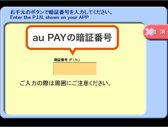 ローソン銀行ATMにau PAYの暗証番号を入力し、確認を押してください。